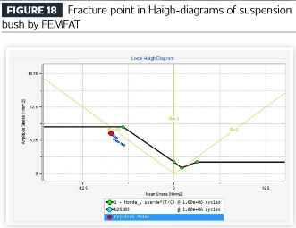 Süspansiyon burcunun yorulma simülasyon sonuçlarının Haigh diyagramı, basınç gerilimi oranları altında kırılmayı ortaya koymaktadır. Her ne kadar çekme ve basma yükleri kauçuk malzemeye eşit olarak uygulansa da analiz, başarısızlığın sonuçta basınç altında başladığını göstermektedir.